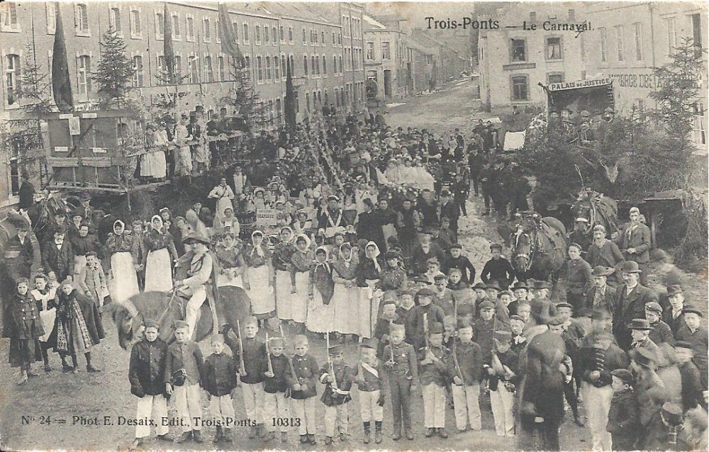 Déjà au début du siècle avant la guerre 14-18, à la mi-carême, la cavalcade avait lieu. La carte de 1906 montre un Trois-Ponts en liesse. Ce rassemblement est sur la place du marché près de l’auberge des Ardennes. On y voit un char érigé en un « palais de justice ». Les chevaux étaient le seul moyen de tirer les chars et beaucoup de routes n’étaient pas encore empierrées.
